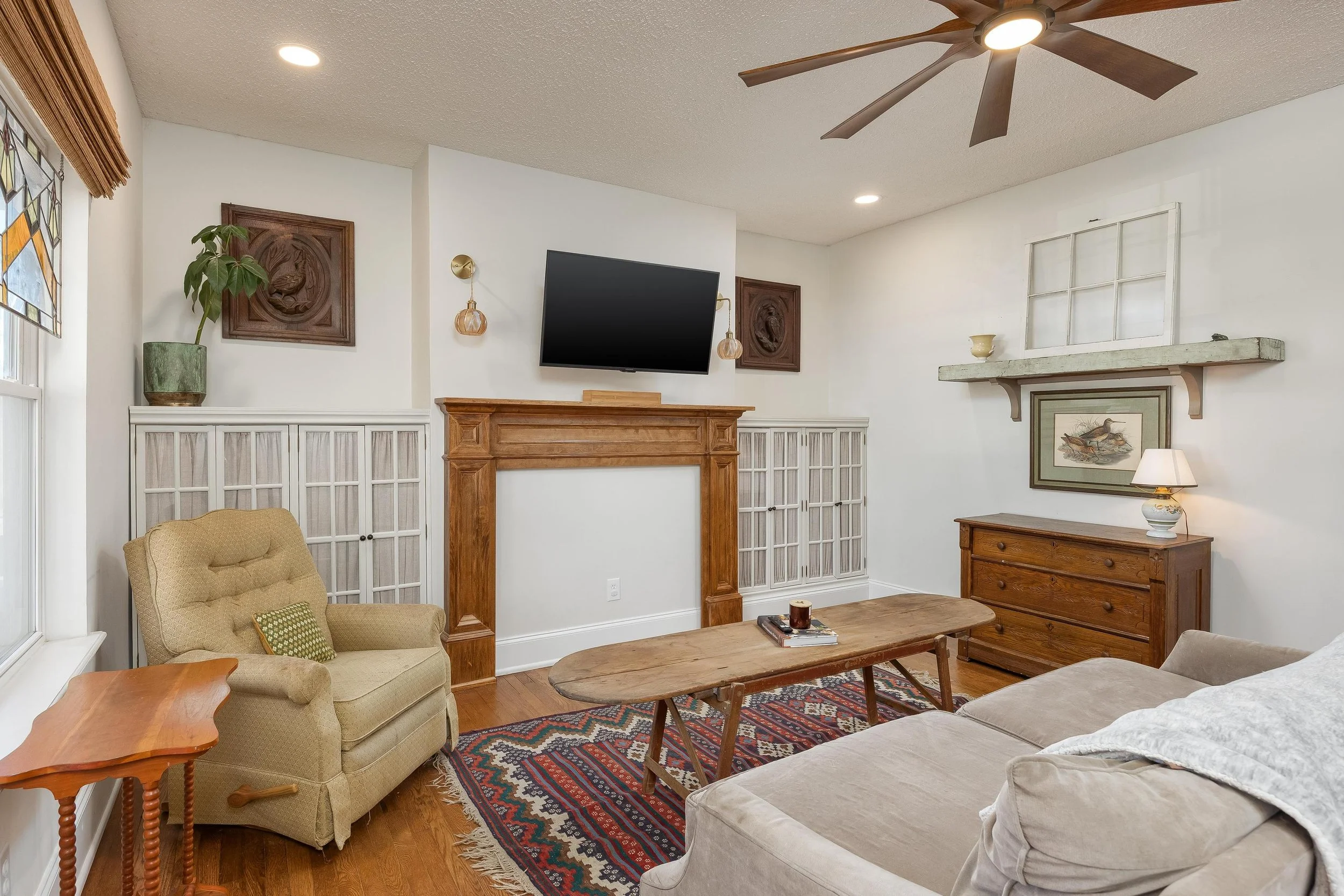 Enter through the front gate and step onto the inviting covered porch before opening the solid wood Dutch door into a light-filled living room. Refinished hardwood floors, built-in cabinetry, and updated lighting create a warm and welcoming atmosphere throughout the main living areas.