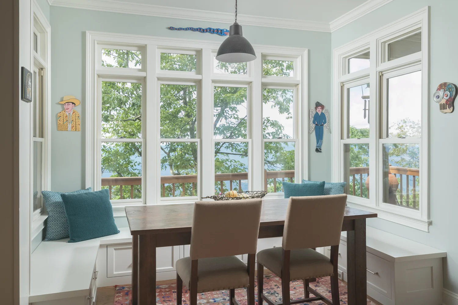 Enjoy views from almost every room but especially from the newly renovated Chef's kitchen. This stunning kitchen was completely gutted and renovated with all Viking appliances, marble countertops, huge butcher block island, a farm sink, a marble bar area, all new light fixtures and all new cabinets. The pantry has pullout drawers, the garbage has a cabinet with room for recycling. A built-in banquet was added offering fabulous casual dining in the kitchen along with seating at the island. Or for a more formal occasion there is the large dining room. The kitchen opens to a lovely living room with vaulted ceiling with custom beams and a wood burning stone fireplace. Custom built cabinets / shelves flank the fireplace.